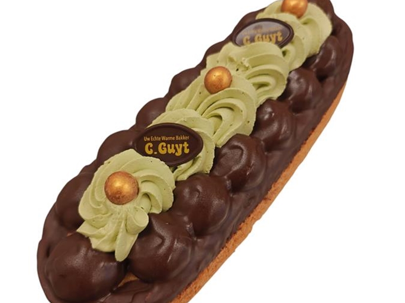 Heerlijke slof met stukjes chocolade en bolletjes zwitserse room gedoopt in chocola en royaal afgespoten met pistache slagroom.